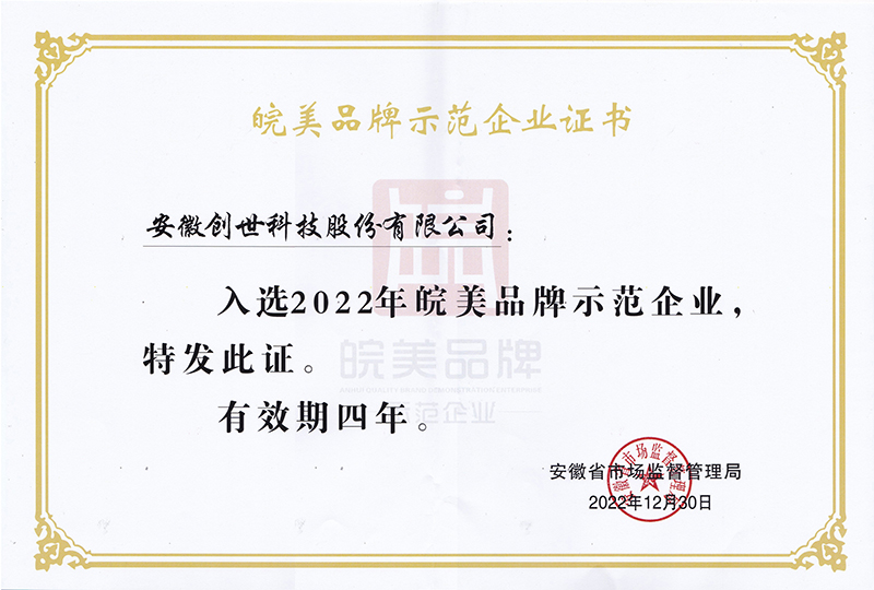 为深入贯彻安徽质量大会精神,认真落实《中共安徽省委安徽省人民政府关于开展质量提升行动推进质量强省建设的实施意见》等文件有关要求,大力推进品牌建设,省市场监管局开展的2022年度皖美品牌示范企业认定,安徽创世科技股份有限公司成功入选,荣获“2022年度皖美品牌示范企业”称号。