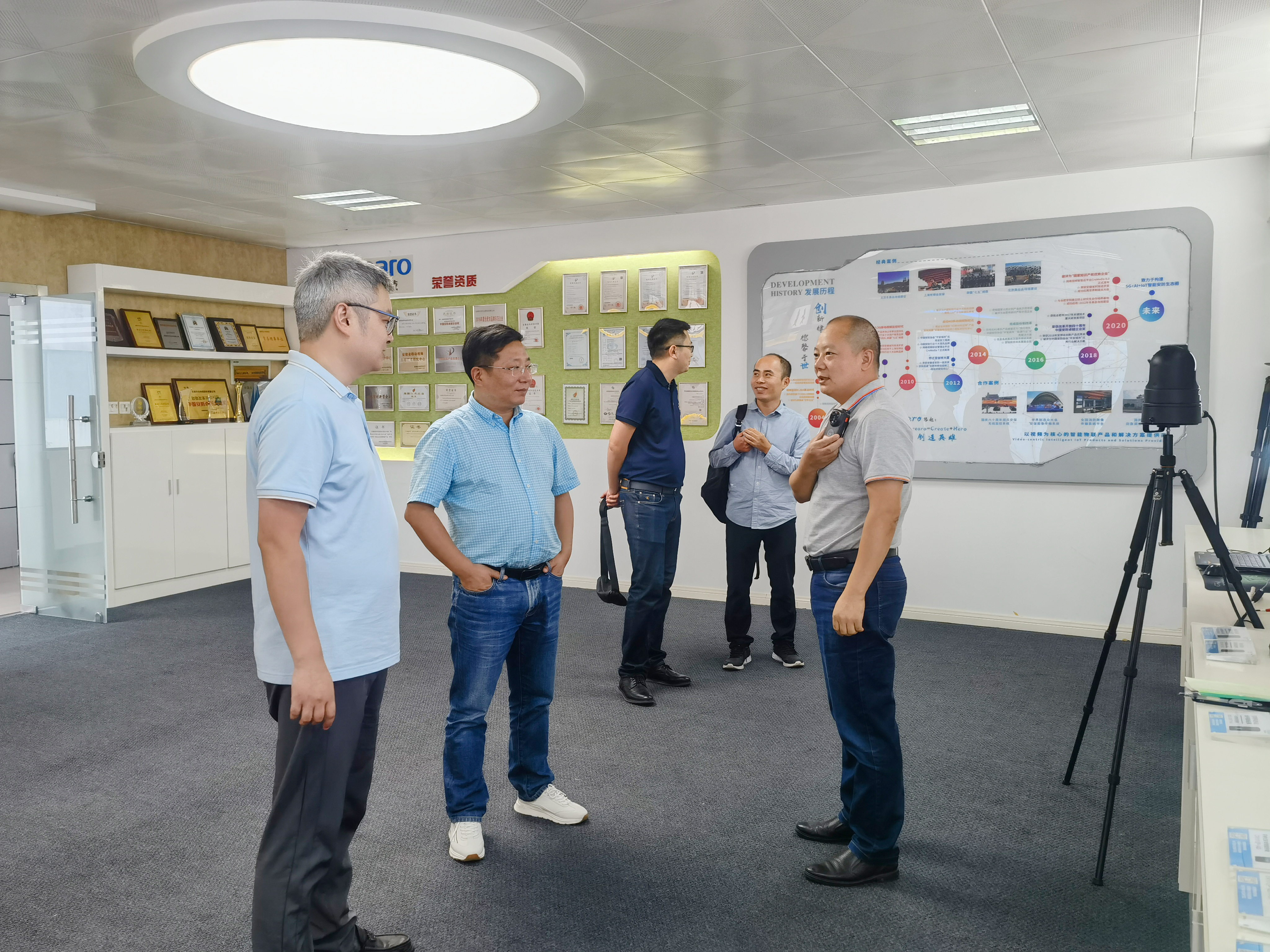 杨院长一行参观了公司的智能展厅,先后听取了创世在平安城市建设与无线视频监控领域创新方面的工作;并深入体验了在人工智能领域的创新产品与科研成果,如智能执法记录仪、应急移动便携平台、智能安全帽、智能车载、一体化警灯和智能布控球等软硬件产品,杨院长一行近距离感受到AI视觉技术赋能智慧城市建设的先进性与优越性,对公司的行业地位和整体实力表示肯定。