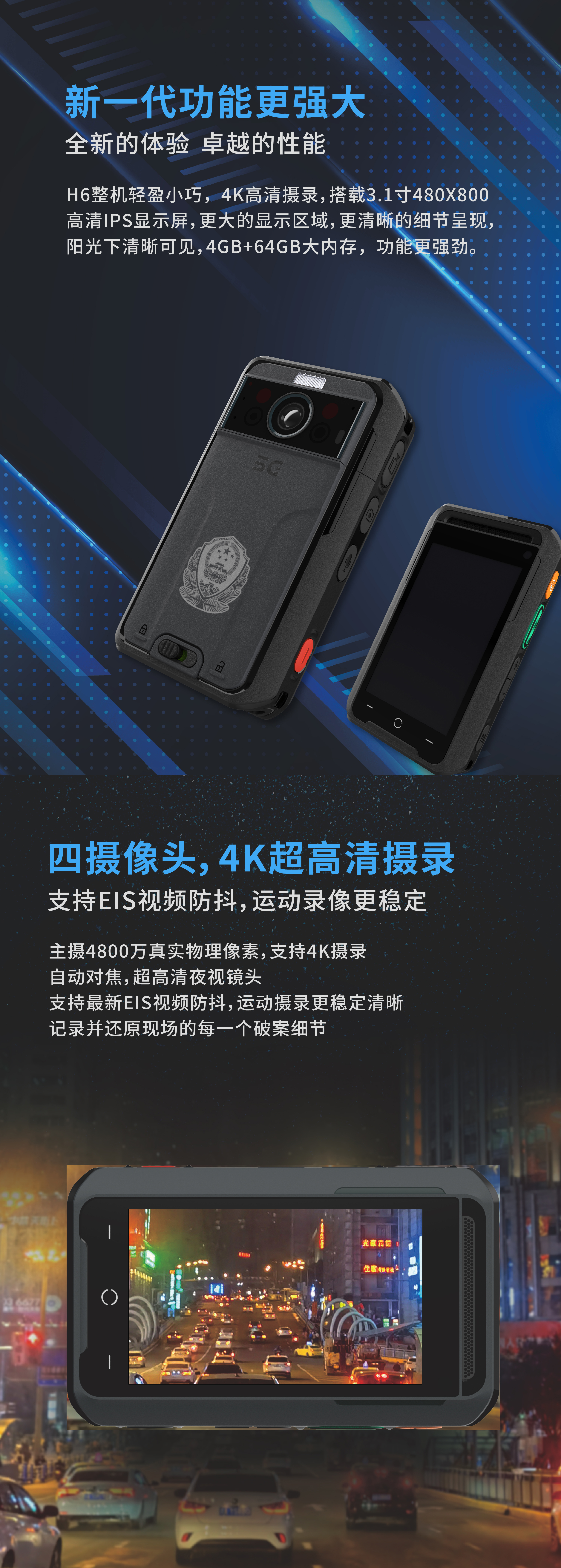 5G智能执法记录仪DSJ-CR7H6A1,采用三防IP68设计、Android10.0操作系统、*速8核处理器、专用按键搭配及盲视操作设计,支持双卡双待,配合3.1寸高清硬屏,体型小巧易携带,可实现数据上传、红外夜视、执法取证、智能识别、语音通话、视频会议等功能,通过搭配专业扩展配件,能够对执法过程中进行动态、静态的现场情况数字化记录,便于公安干警在各种环境中执法使用。