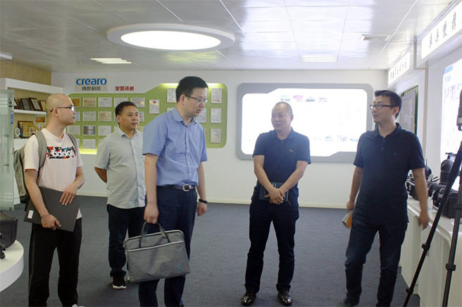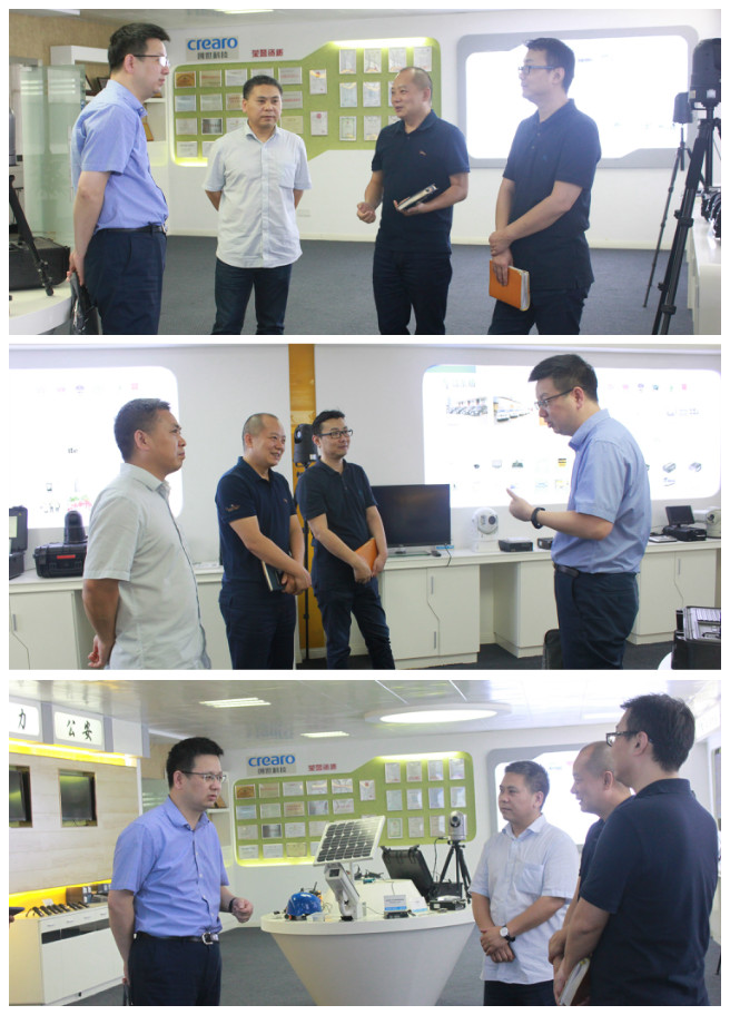 在总经理张传金等公司领导的陪同下,来访领导一行参观了创世科技的多功能产品演示厅。参观中,市场总监邵磊为来访领导重点介绍了公司的发展历程、荣誉资质、经营情况,并详细介绍了4G智能执法记录仪、智能高清布控球、4G安全帽、安卓单兵等无线应急通讯设备的实战应用,得到了来访领导的高度肯定。