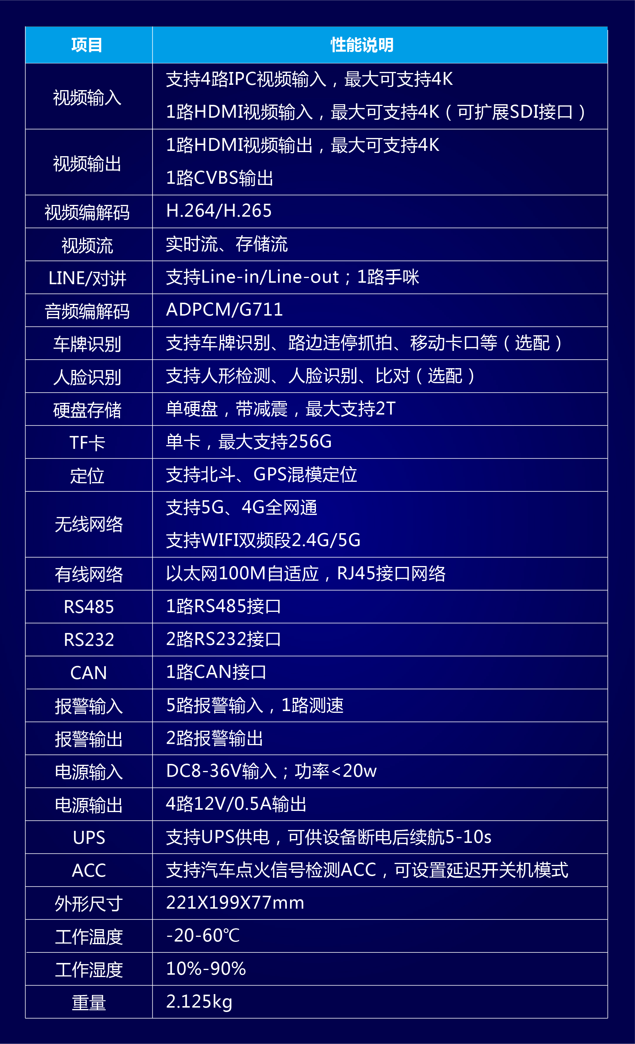 前端车辆安装智能高清车载终端,通过接入车载云台摄像机、IPC网络摄像机、HDMI/SDI视频源等图像采集终端,将采集的图像进行压缩,编码实时传输到后端指挥中心的监控平台,支持1路CVBS和1路HDMI视频输出。