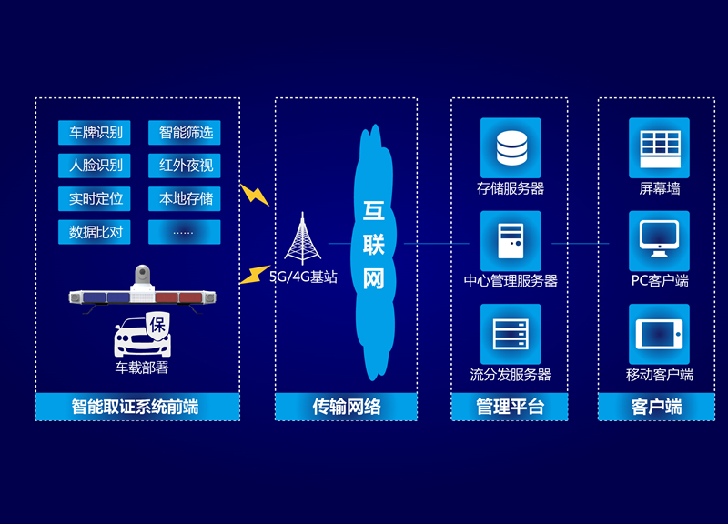 本系统由一体化智能警灯、传输网络、视频综合管理平台软件、客户端四大部分组成。基于5G无线传输的智能取证系统,前端设备对路边违停车辆进行自动抓拍,对违法变道、占用公交车道等交通违法行为进行手动抓拍,对道路视频进行实时采集;通过5G网络将违法图片、违法视频和实时视频传输到管理平台;管理平台对数据进行分类、统计和存储;后台工作人员可以通过客户端对违法图片和违法视频进行查看和审核,同时可以通过实时视频远程了解现场情况。