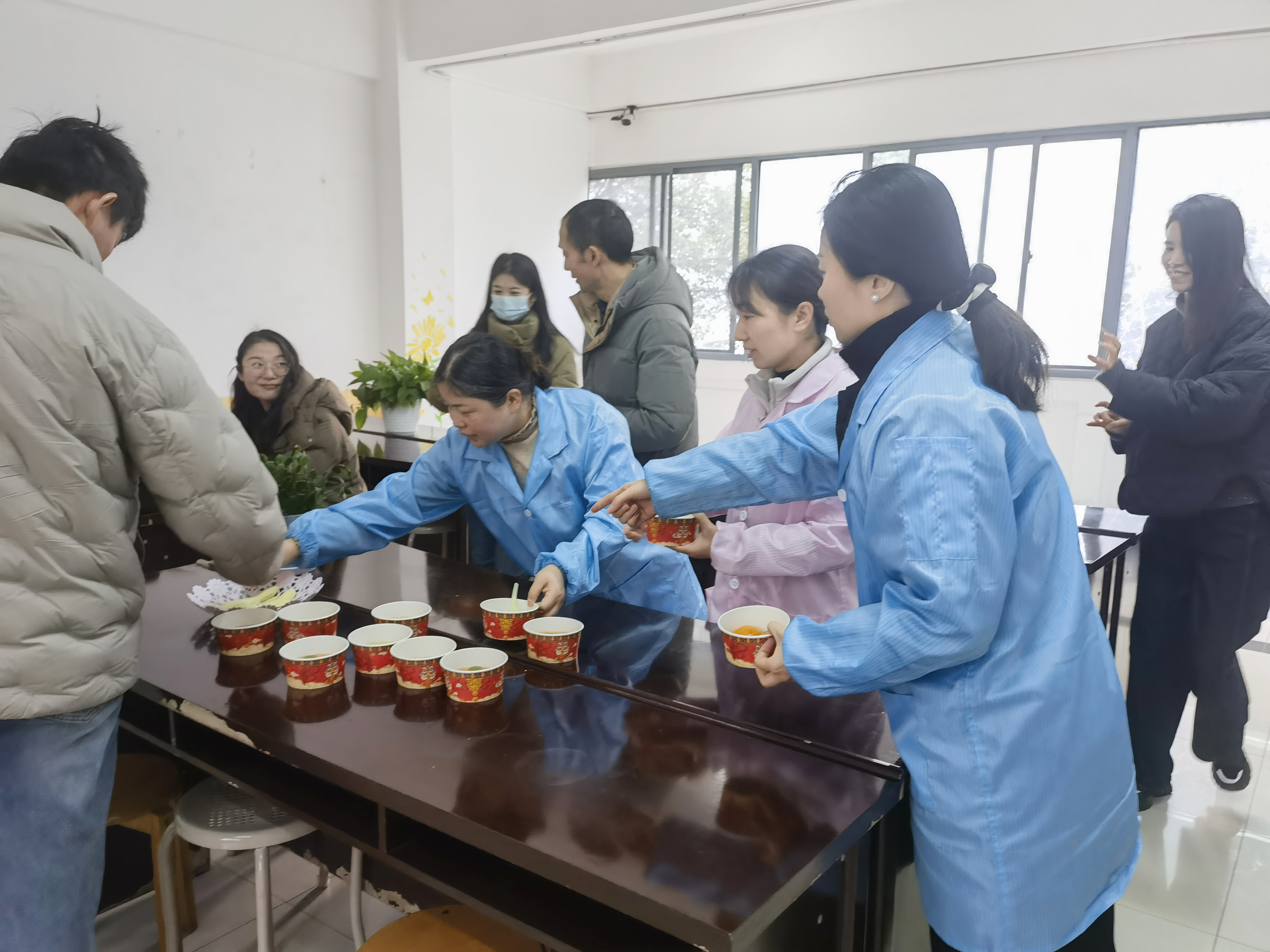 早上,公司为大家准备了暖心甜蜜的汤圆餐,工会人员把一个个白白胖胖的汤圆放入锅中,勺搅防粘,让它们均匀受热,不一会儿,一锅热气腾腾的汤圆就煮好了,大家接过飘香的汤圆,一口下去,满是香甜和软糯,同时分享着各自的工作趣事,空气中弥漫着温馨与甜蜜。