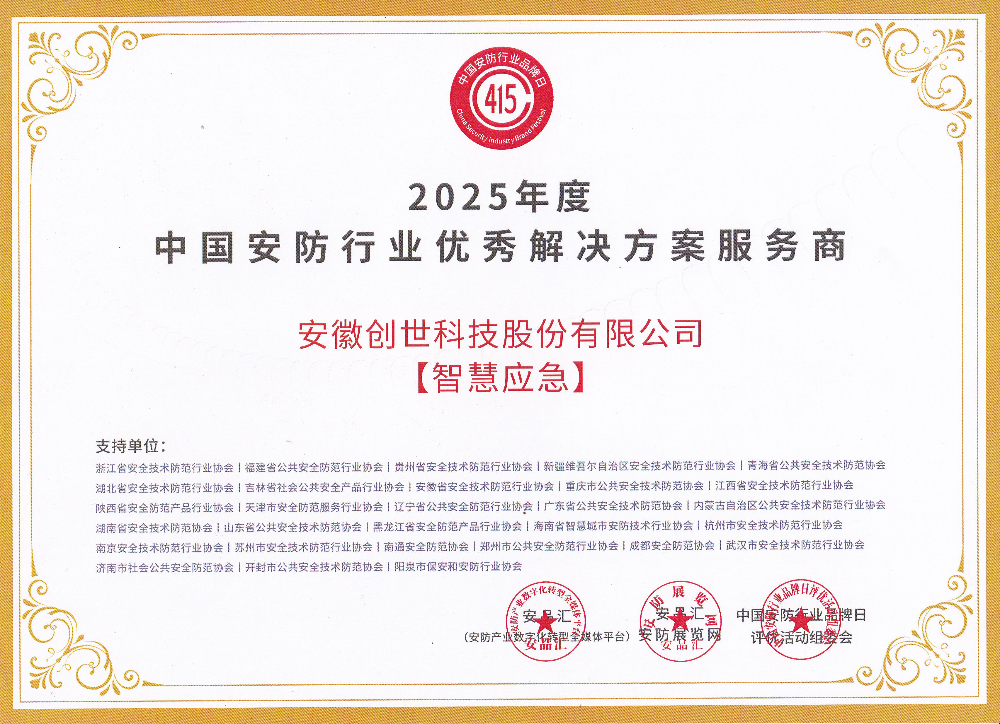 经各省市安防协会初审、专家组终审,安徽创世科技股份有限公司获得“中国安防行业十大品牌”、“中国安防行业优秀解决方案服务商”奖项,总经理张传金荣获“第七届中国安防年度人物”称号。这三项奖项的背后,是创世科技深耕安防领域、持续创新发展的必然结果,亦离不开安徽省安防协会在行业发展、资源整合、政策引导等多方面给予的全方位、强有力的支持与推动。
