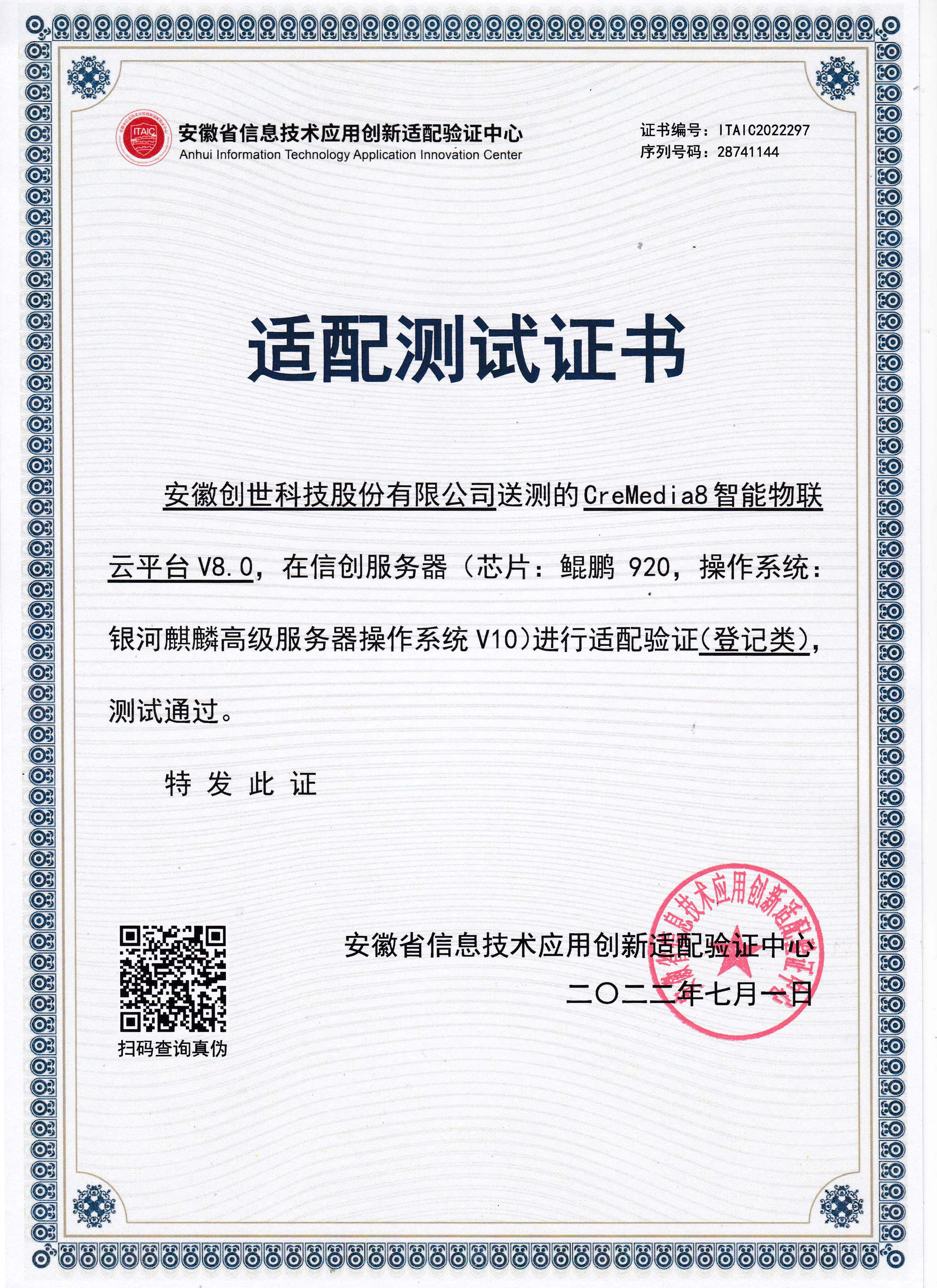 创世科技作为安防行业砥砺创新的践行者,为响应国家战略,加快信息自主安全的建设规划,打造安防行业国产化生态圈。近日,创世科技自主研发的“CreMedia8智能物联云平台”正式通过安徽省信息技术应用创新适配验证中心的适配认证,产品符合信创环境需要,能在多个不同国产环境下稳定运行,性能达标、安全可靠,顺利获得*、专业的省级适配测试证书,积*推进国产化操作系统在移动视频监控领域的深根落地。