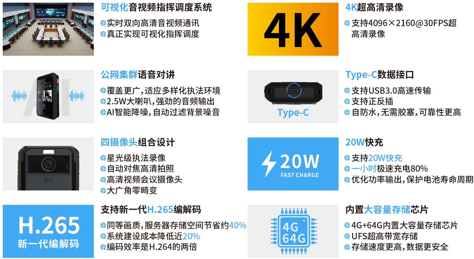5G智能执法记录仪可广泛应用于交警、城管、公安等现场执法取证场合。5G智能执法记录仪的使用*了执法办案过程全程记录、无缝对接,既规范了执法人员的执法活动,又有助于提升执法水准,特别是在保护执法人员自身权益等方面发挥了不可替代的作用。面对摄像头,市民更加配合执法人员的工作,执法人员也更加规范自己的行为,阳光执法,文明执法。