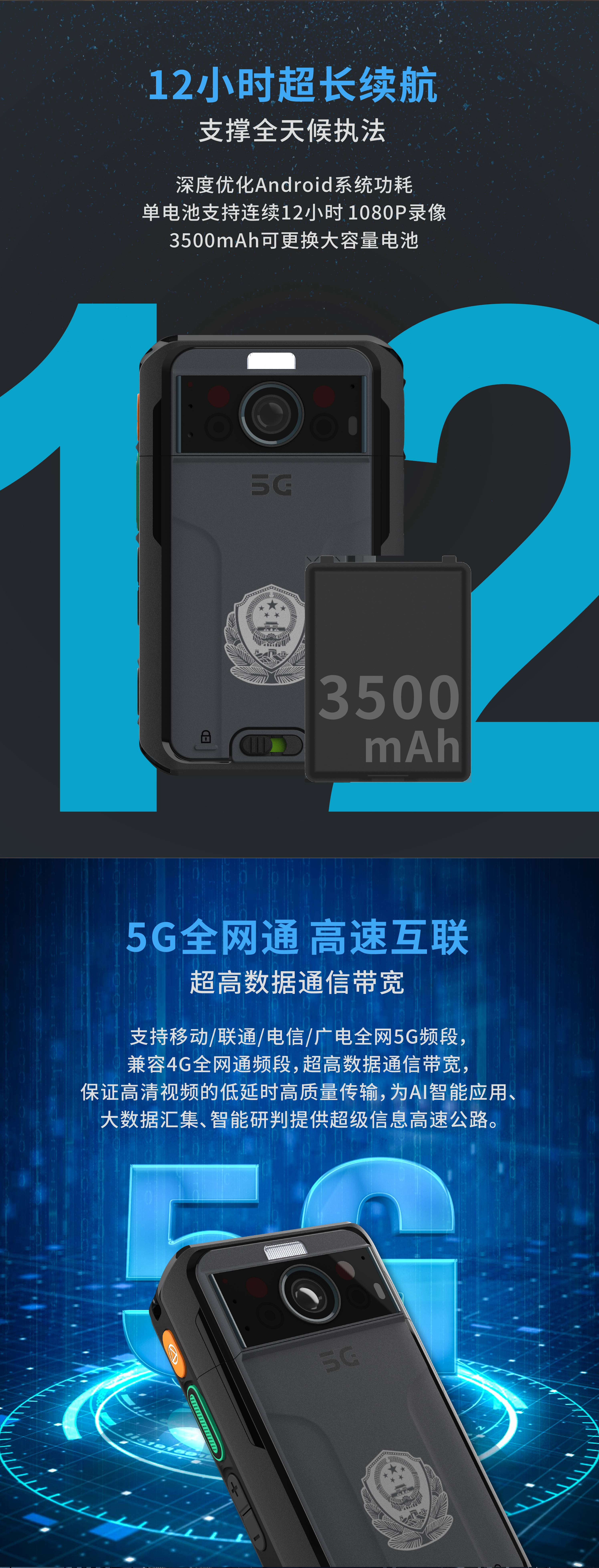 5G智能执法记录仪DSJ-CR7H6A1,采用三防IP68设计、Android10.0操作系统、*速8核处理器、专用按键搭配及盲视操作设计,支持双卡双待,配合3.1寸高清硬屏,体型小巧易携带,可实现数据上传、红外夜视、执法取证、智能识别、语音通话、视频会议等功能,通过搭配专业扩展配件,能够对执法过程中进行动态、静态的现场情况数字化记录,便于公安干警在各种环境中执法使用。