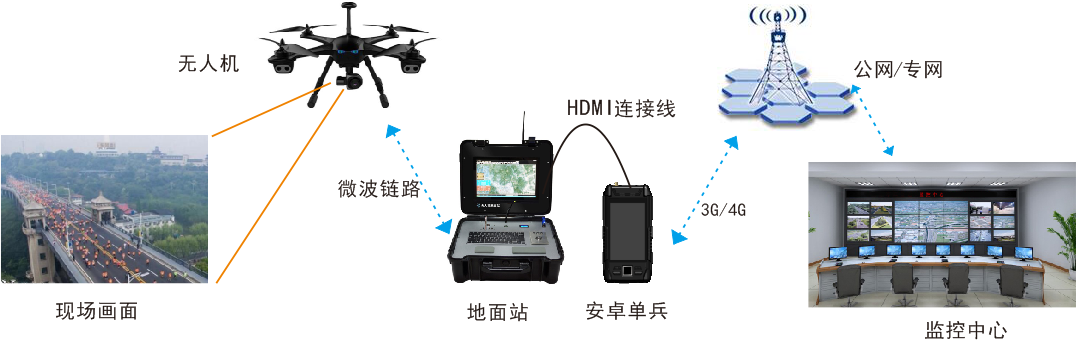 无人机系统架构包括:无人机飞控系统、地面指挥控制系统、微波无线实时图像传输系统、供电单元、5G/4G图传系统和任务设备系统等。将无人机视频源与发射机连接,使其形成无人机无线视频发射系统;无人机视频发射机发射的信号通过地面无线图像接收平台接收,接收平台可以清晰的将无人机采集到的图像显示在显示屏幕上,并通过平台外接HDMI口将视频信号传至图传设备上,图传设备将获得的视频源进行编码后,经过5G/4G无线网络或专网通信网络传输至后端中心平台,再由监控中心显示出来。