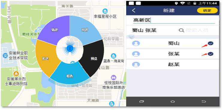 支持以圆形、矩形和不规则三种方式,使用多种方法进行框选选中,用以发送命令、组呼和一键预览。