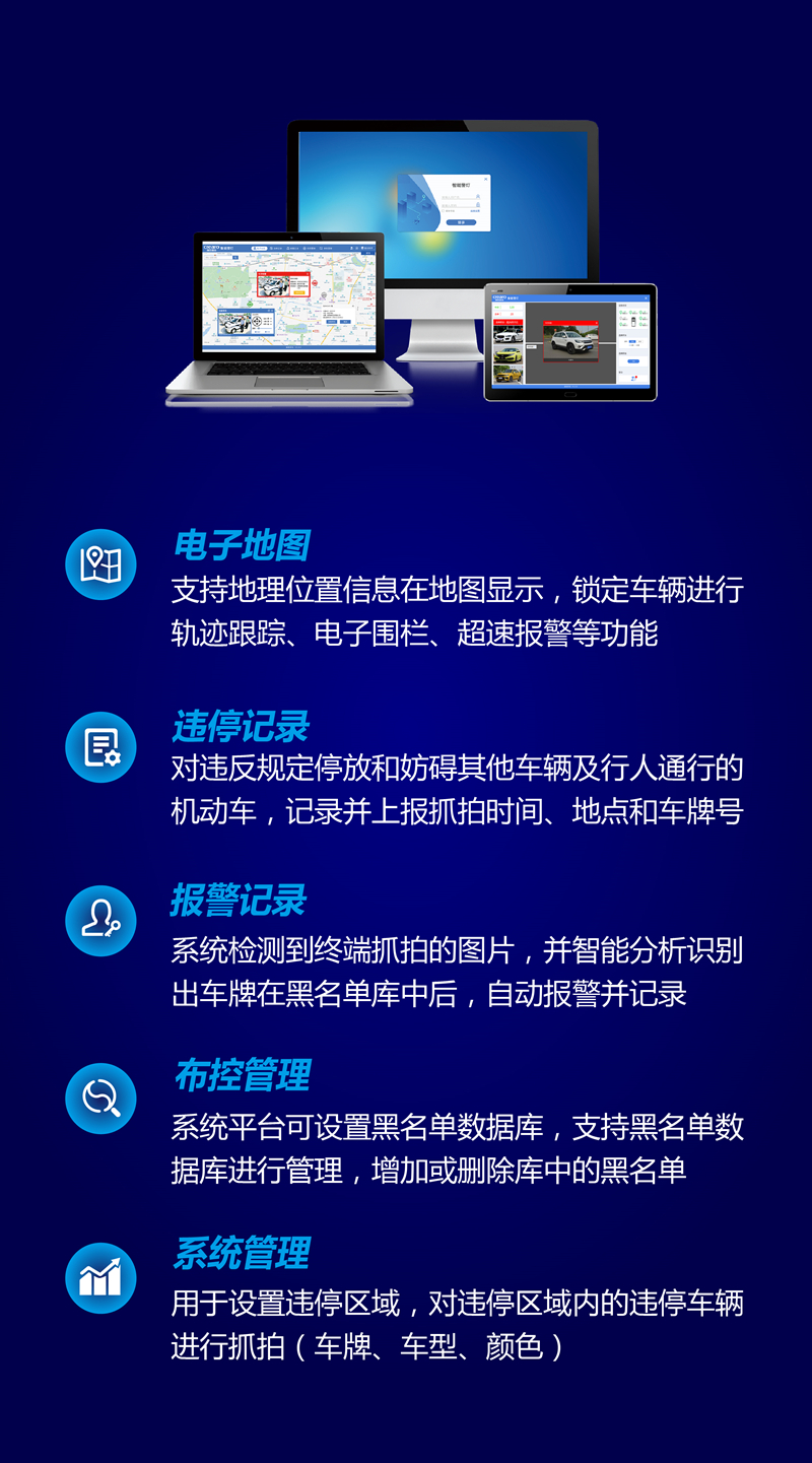 本系统由一体化智能警灯、传输网络、视频综合管理平台软件、客户端四大部分组成。基于5G无线传输的智能取证系统,前端设备对路边违停车辆进行自动抓拍,对违法变道、占用公交车道等交通违法行为进行手动抓拍,对道路视频进行实时采集;通过5G网络将违法图片、违法视频和实时视频传输到管理平台;管理平台对数据进行分类、统计和存储;后台工作人员可以通过客户端对违法图片和违法视频进行查看和审核,同时可以通过实时视频远程了解现场情况。