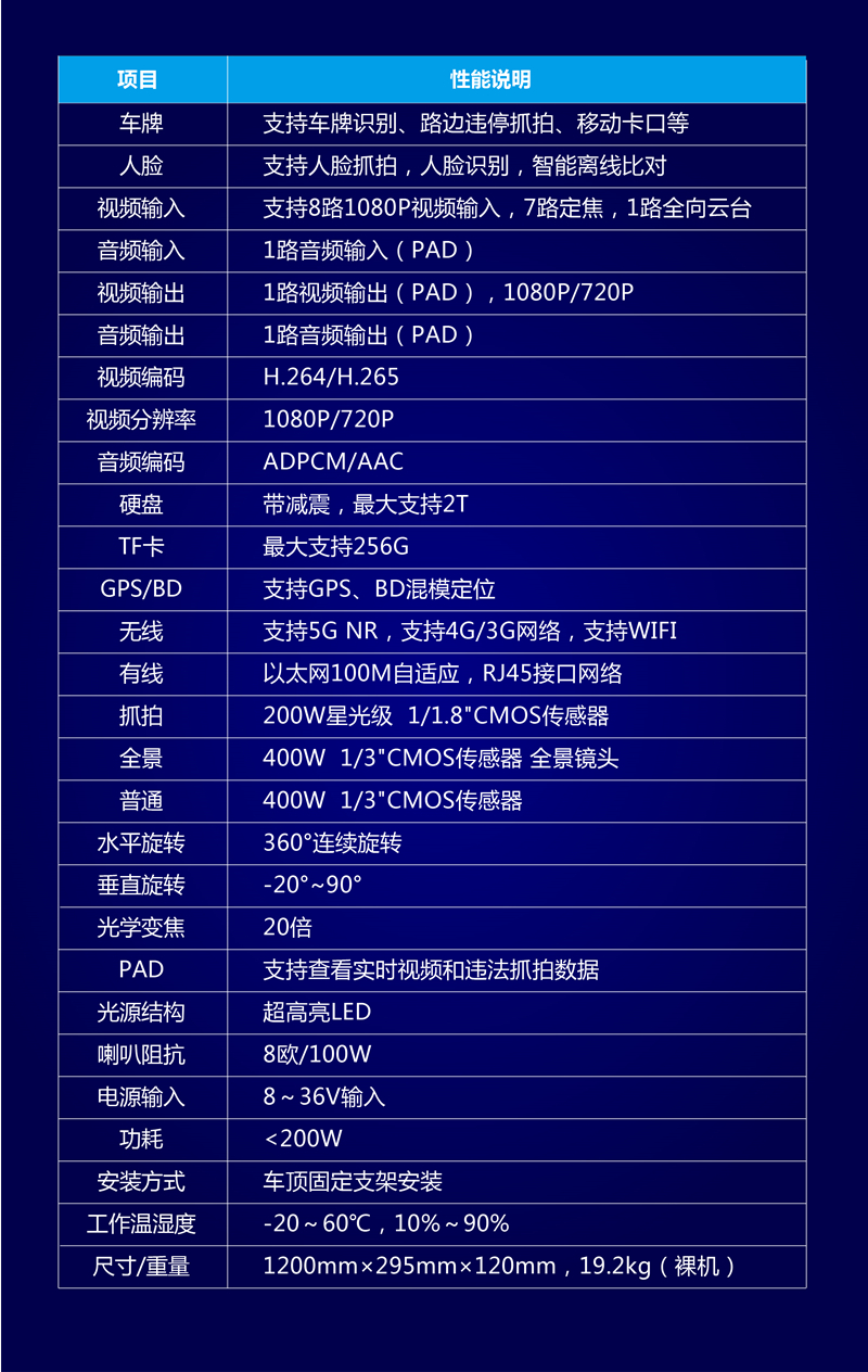 一体化智能警灯,采用一体化结构设计、嵌入式Linux操作系统,是针对警用执法、应急指挥开发的专用智能警用终端。可实现本地高清录像存储、5G/WIFI无线网络传输、支持北斗/GPS双模定位、支持远程控制、车牌识别、人脸识别及警灯和警号的功能。可以应用在违停抓拍、违法抓拍、移动卡口、限号抓拍等场景。