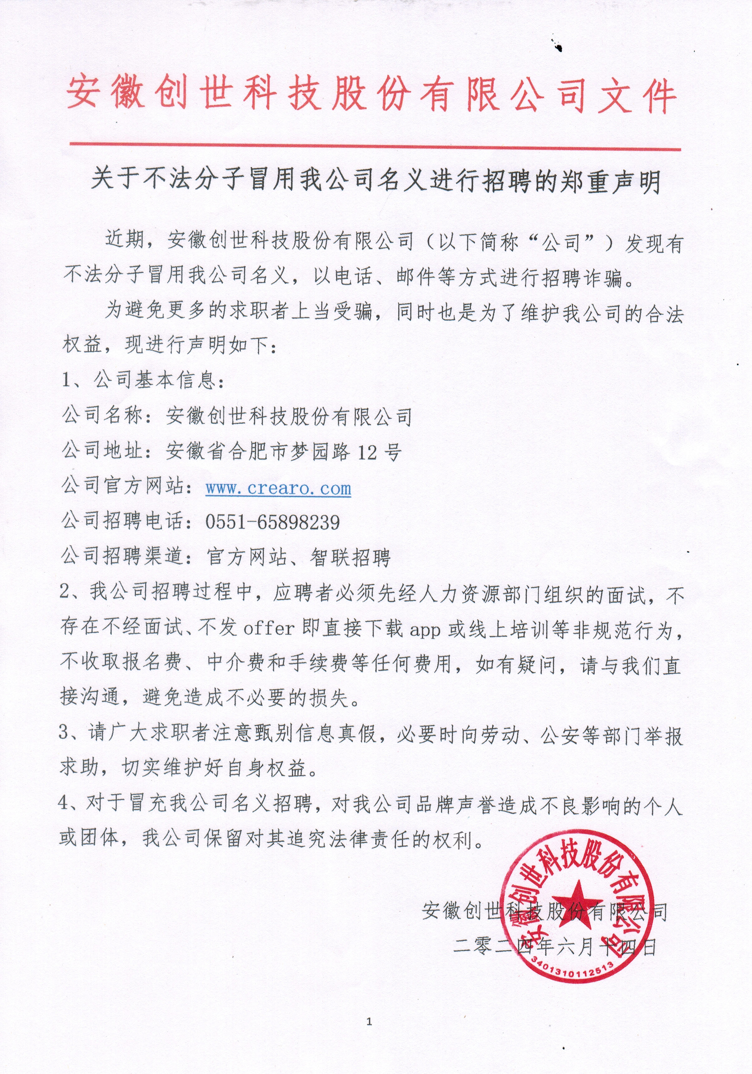 近期,安徽创世科技股份有限公司(以下简称“公司”)发现有不法分子冒用我公司名义进行招聘诈骗,这些不法分子通过邮件等方式与求职者沟通,进行诈骗。此行为严重损害了求职者的利益和我公司形象。针对此种不法行为,我公司表示强烈谴责,并保留采取法律手段追究其责任的权利。