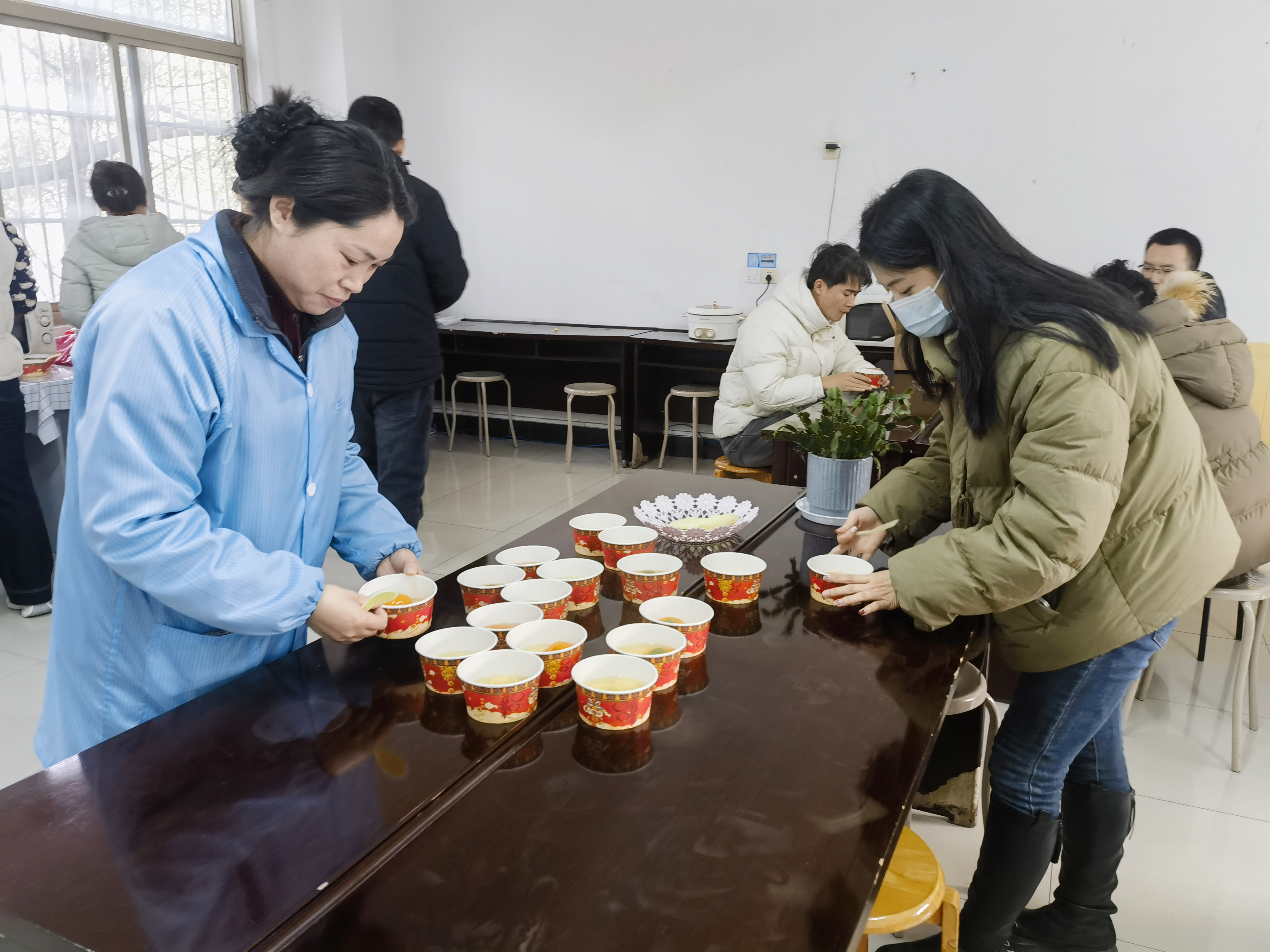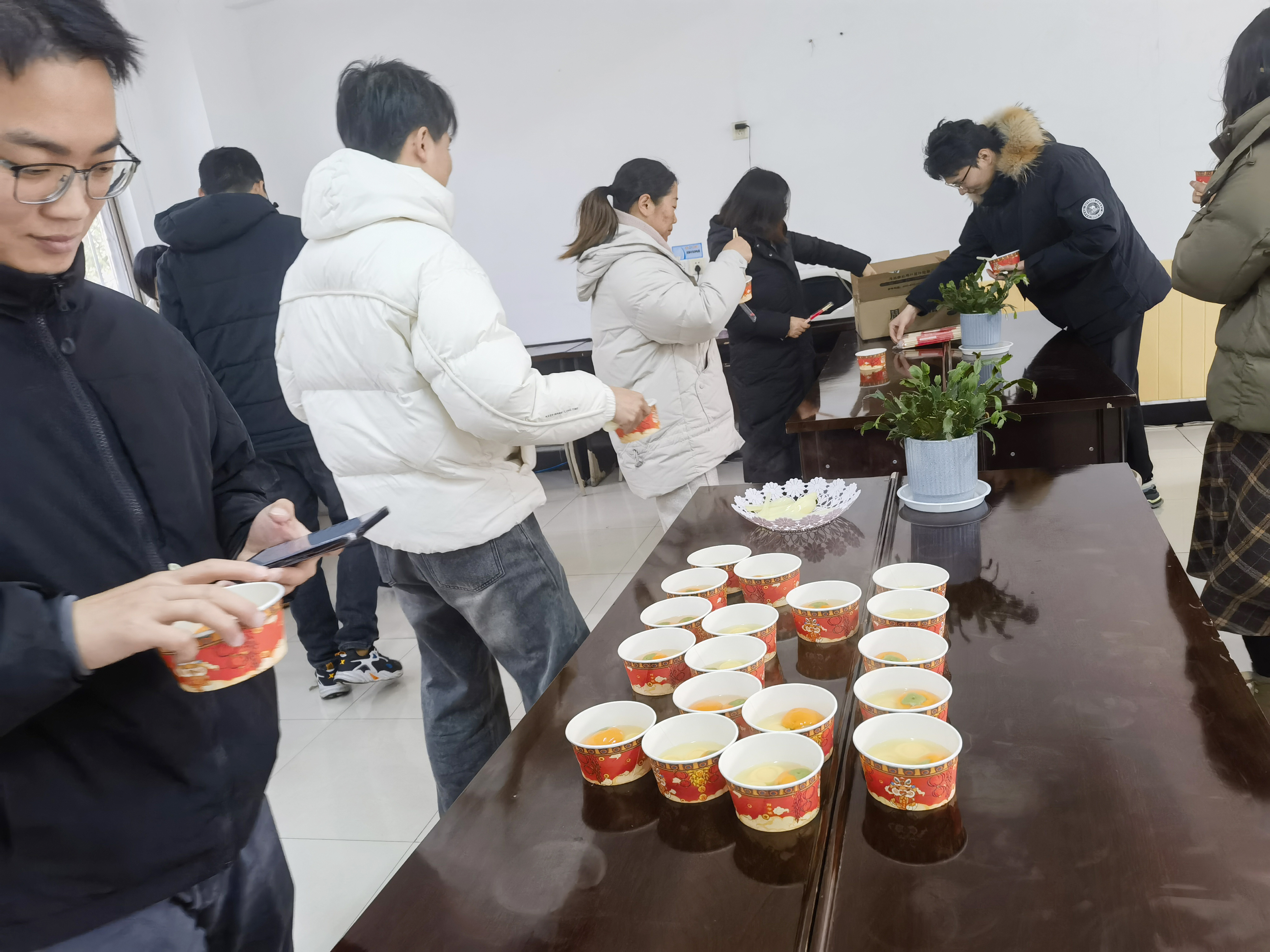早上,公司为大家准备了暖心甜蜜的汤圆餐,工会人员把一个个白白胖胖的汤圆放入锅中,勺搅防粘,让它们均匀受热,不一会儿,一锅热气腾腾的汤圆就煮好了,大家接过飘香的汤圆,一口下去,满是香甜和软糯,同时分享着各自的工作趣事,空气中弥漫着温馨与甜蜜。
