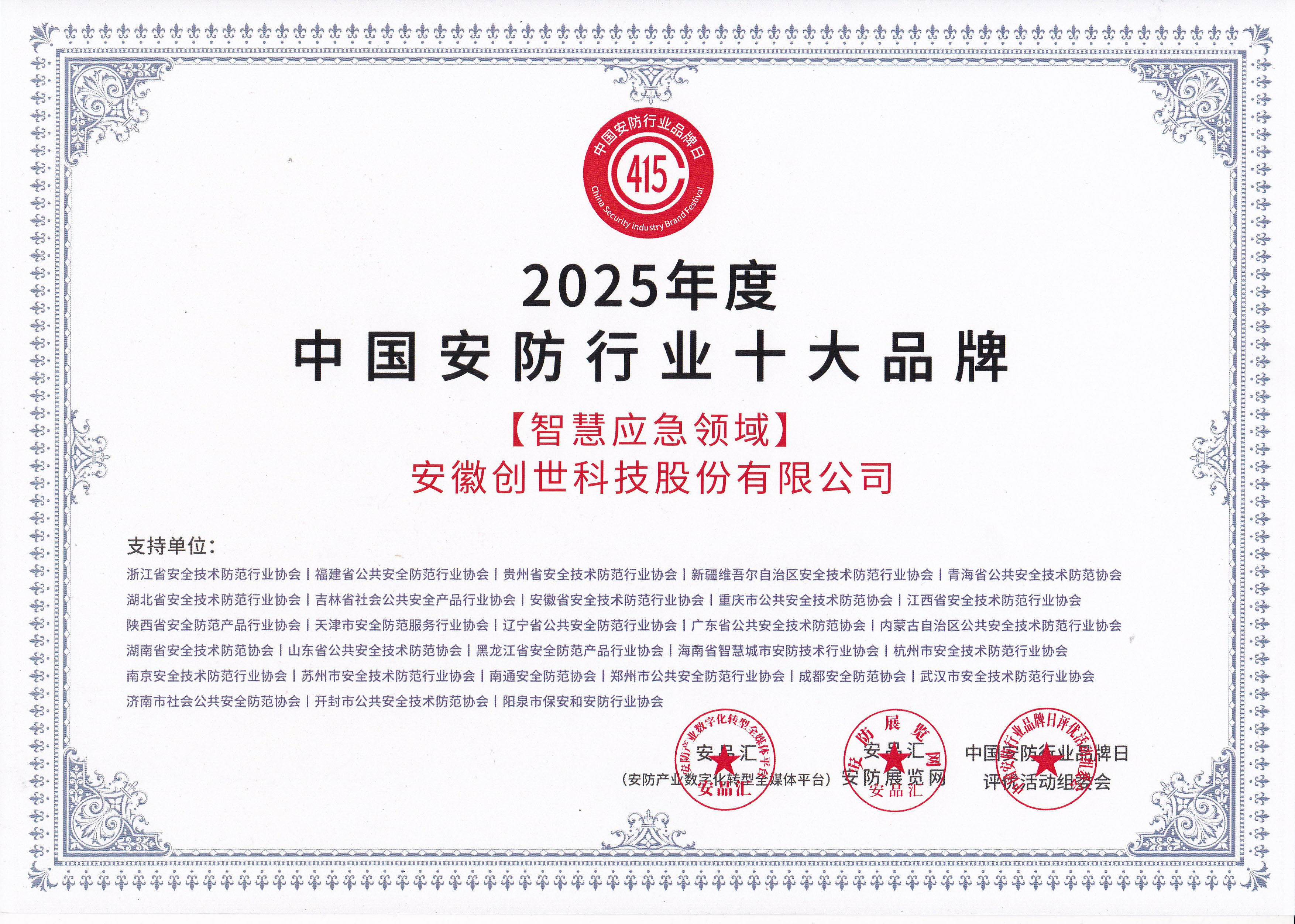 经各省市安防协会初审、专家组终审,安徽创世科技股份有限公司获得“中国安防行业十大品牌”、“中国安防行业优秀解决方案服务商”奖项,总经理张传金荣获“第七届中国安防年度人物”称号。这三项奖项的背后,是创世科技深耕安防领域、持续创新发展的必然结果,亦离不开安徽省安防协会在行业发展、资源整合、政策引导等多方面给予的全方位、强有力的支持与推动。