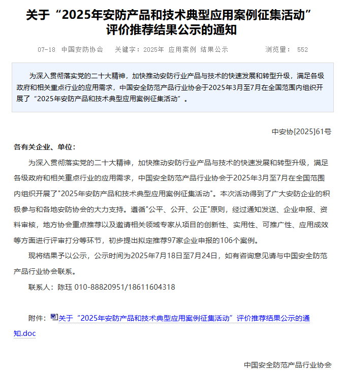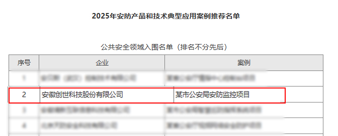 近日,中国安全防范产品行业协会公示了关于“2025年安防产品和技术典型应用案例”拟定名单,安徽创世科技股份有限公司申报的公安局安防监控项目,经过资料审核、地方协会重点推荐、相关领域专家综合评定,最终成功入选。